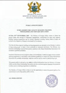 The Ministry of Foreign Affairs and Regional Integration has announced the availability of scholarships for Ghanaians, resulting from diplomatic engagements with partner countries.
