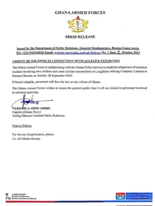 “The Ghana Armed Forces is collaborating with the Ghana Police Service to establish allegations of extortion incident involving two soldiers and some civilian accomplices at LongShine Mining Company Limited in Prestea-Obouhu.” It assured that personnel found culpable will face the law as any citizen of Ghana.