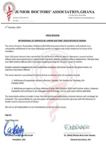 The Junior Doctors’ Association of Ghana (JDA-GH) has declared that its members will withdraw their services nationwide in response to alleged neglect and unfair treatment.