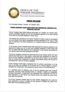 A statement from the Office of the Former President emphasized the importance of party cohesion as the NPP looks ahead to the 2028 general elections.