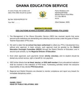 The Ghana Education Service (GES) has issued a caution to school heads against demanding or collecting unapproved levies under the guise of Parent-Teacher Association (PTA) dues.