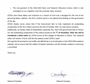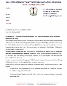 It therefore added that the government’s failure to honour their demands by November 7, 2025, “will be considered a strike notice by CETAG across all the colleges of Education in Ghana.”