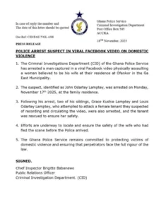 The Ghana Police Service reaffirmed its commitment to protecting victims of domestic violence and ensuring that offenders are brought to justice. The statement emphasised that the Service will continue to act decisively in all such cases and urged the public to report incidents of abuse promptly.
