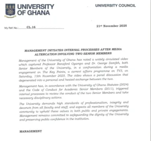 In a statement, the University indicated that management has taken note of the incident and, in accordance with the University of Ghana Statutes (2024) and the Code of Conduct for Academic Senior Members (2011), has activated internal procedures to review the conduct of both academics and determine appropriate disciplinary measures.