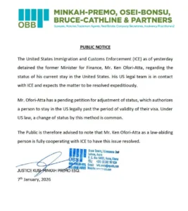 In a public notice issued on Wednesday, January 7, 2026, Ghana-based law firm Minkah-Premo, Osei-Bonsu, Bruce-Cathline and Partners (MPOBB) clarified that the ICE’s action was related to questions surrounding Mr. Ofori-Atta’s continued presence in the United States, rather than any allegations of criminal wrongdoing.