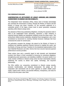 In a statement issued on Monday, January 12, 2026, the IPGs said they “wish to formally acknowledge and commend the Government of Ghana, through the Ministry of Finance and the Ministry of Energy and Green Transition, for the successful settlement of a substantial portion of the legacy arrears owed to power generation companies operating within Ghana’s energy sector.”