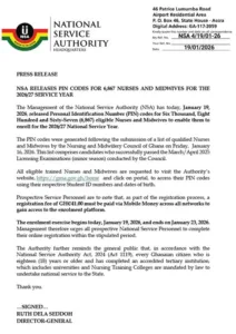 In a statement issued on Monday, January 19, 2026, the Authority indicated that the PIN codes were generated subsequent to the Nursing and Midwifery Council of Ghana’s submission of a list of qualified candidates on Friday, January 16, 2026.