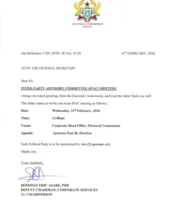 The meeting will take place at 11:00 a.m. at the EC’s Corporate Head Office in Accra, focusing exclusively on matters relating to the conduct and organisation of the Ayawaso East by-election. The Commission has directed that each political party be represented by only two delegates at the meeting.