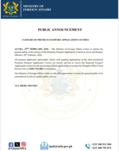 The Ministry of Foreign Affairs has announced the immediate closure of Ghana’s Premium Passport Application Centres in Accra and Kumasi, effective 20 February 2026.